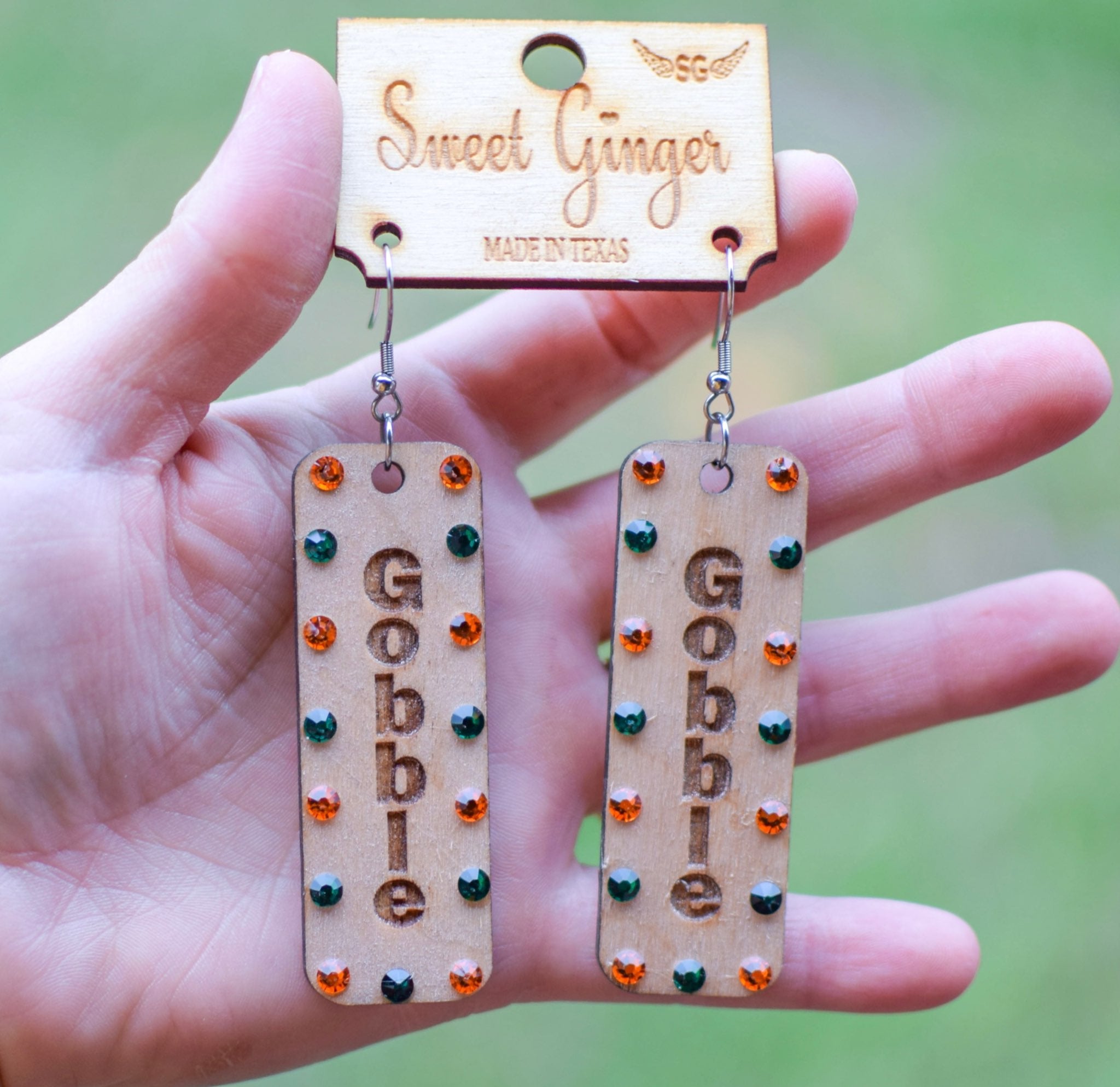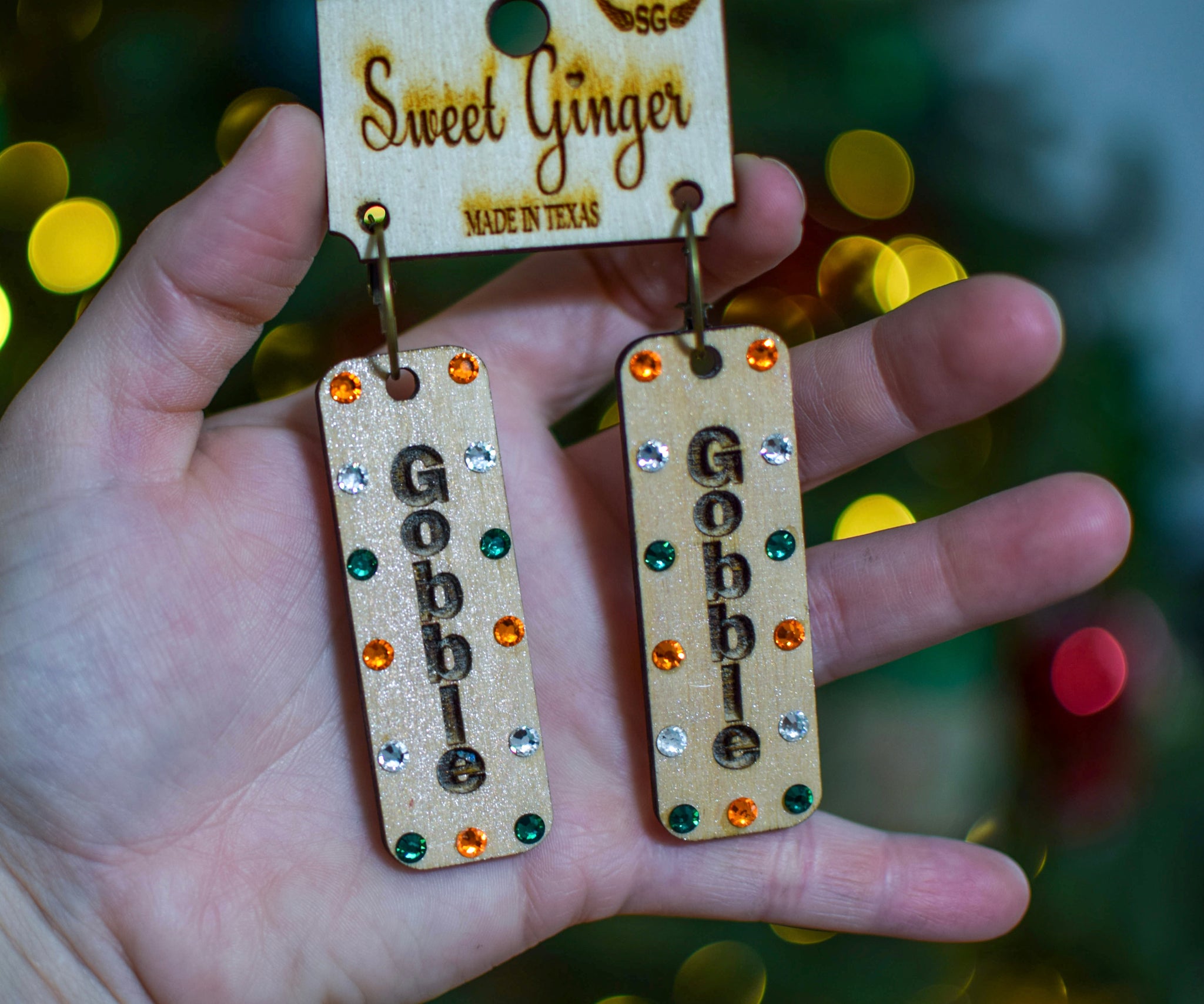 Wood tags, stained with rose gold stain. The words Gobble written on each earring. Stones are green and orange.