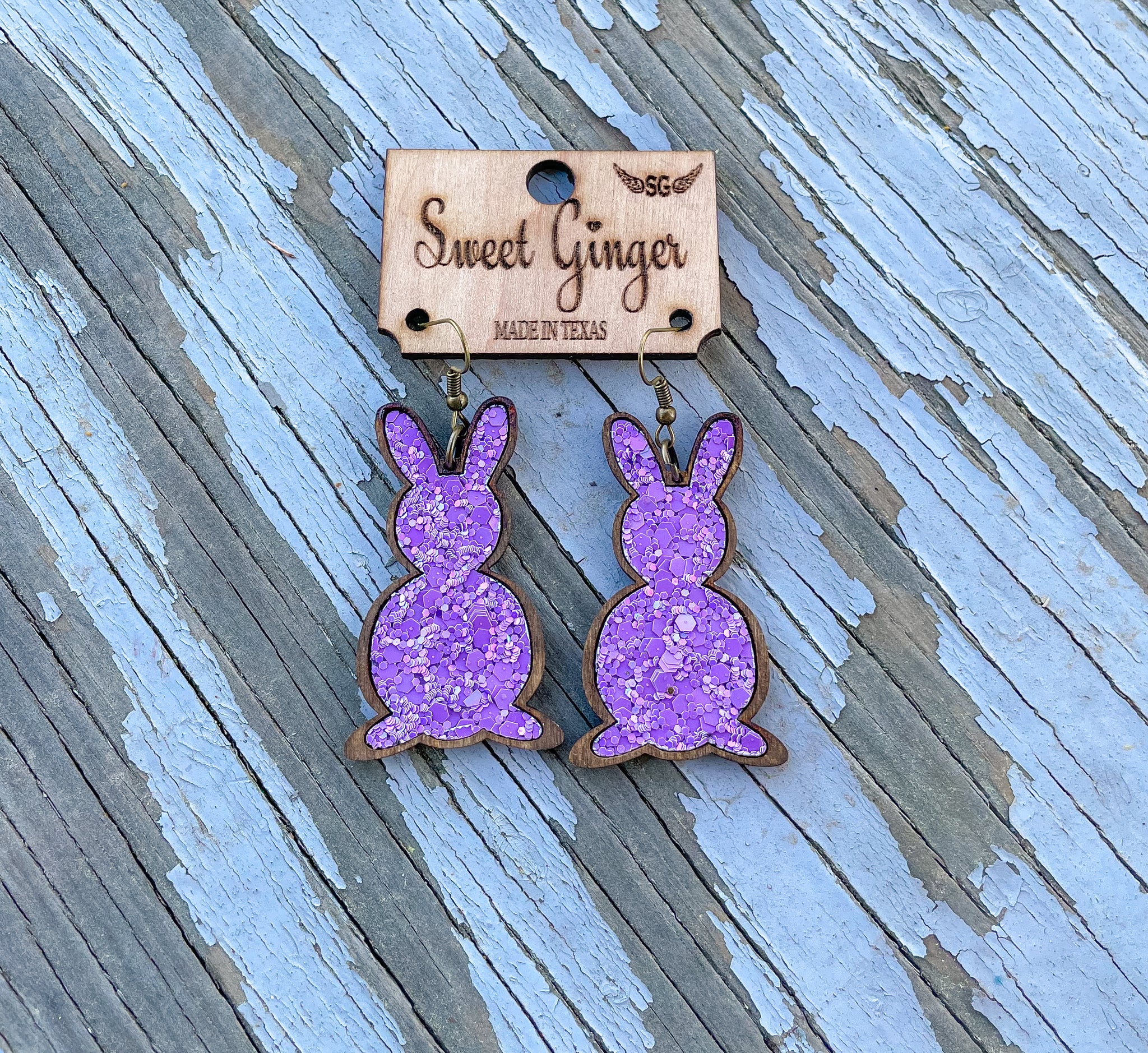 Stained bunny earrings with lavender glitter cork