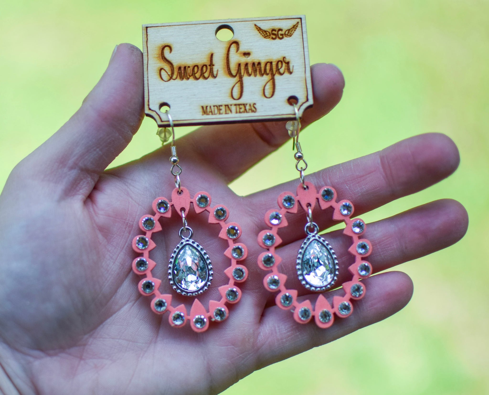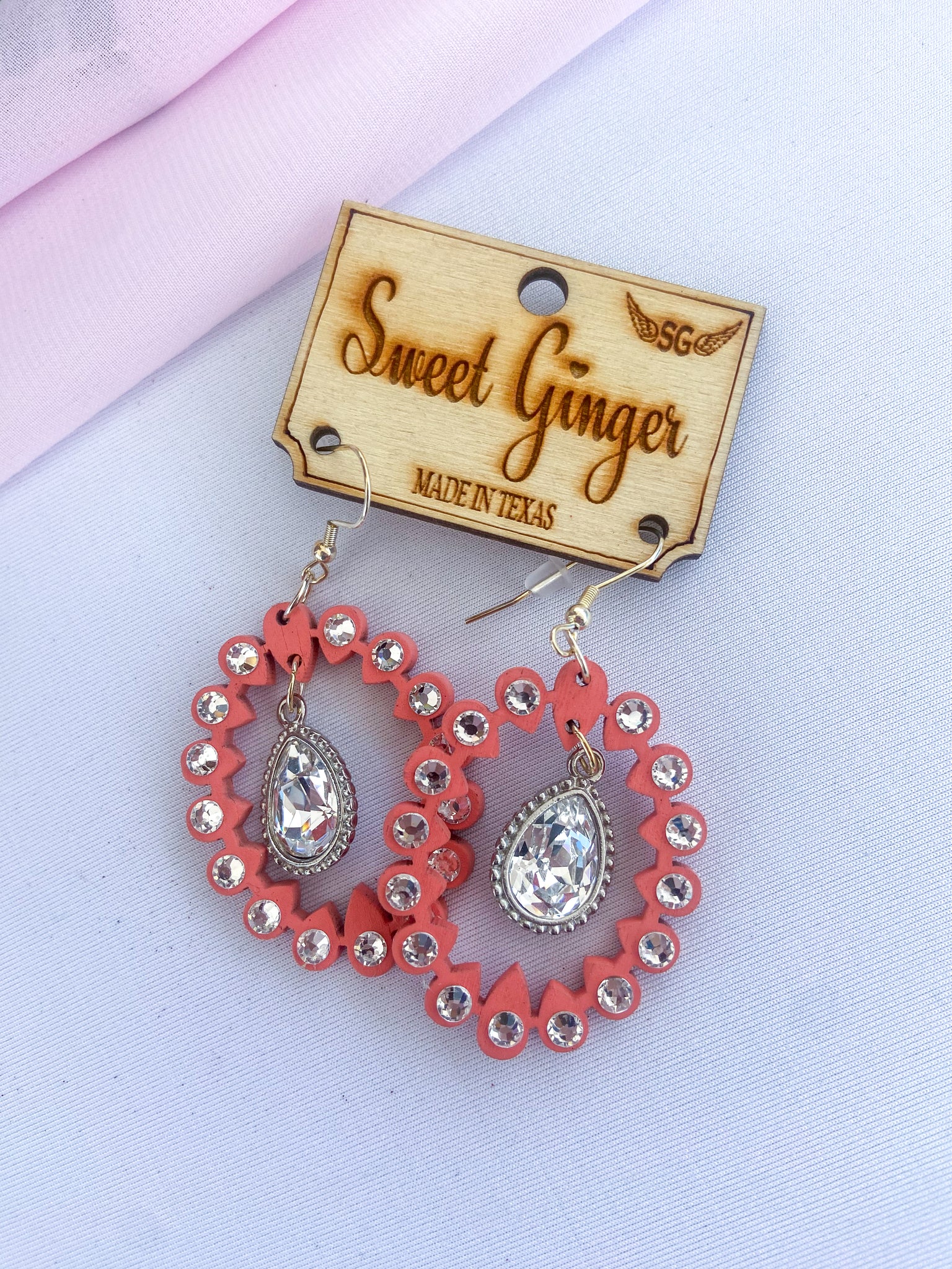 Such a fun summer coral color with clear stones around the edge and a beautiful large pear setting and stone in the center.