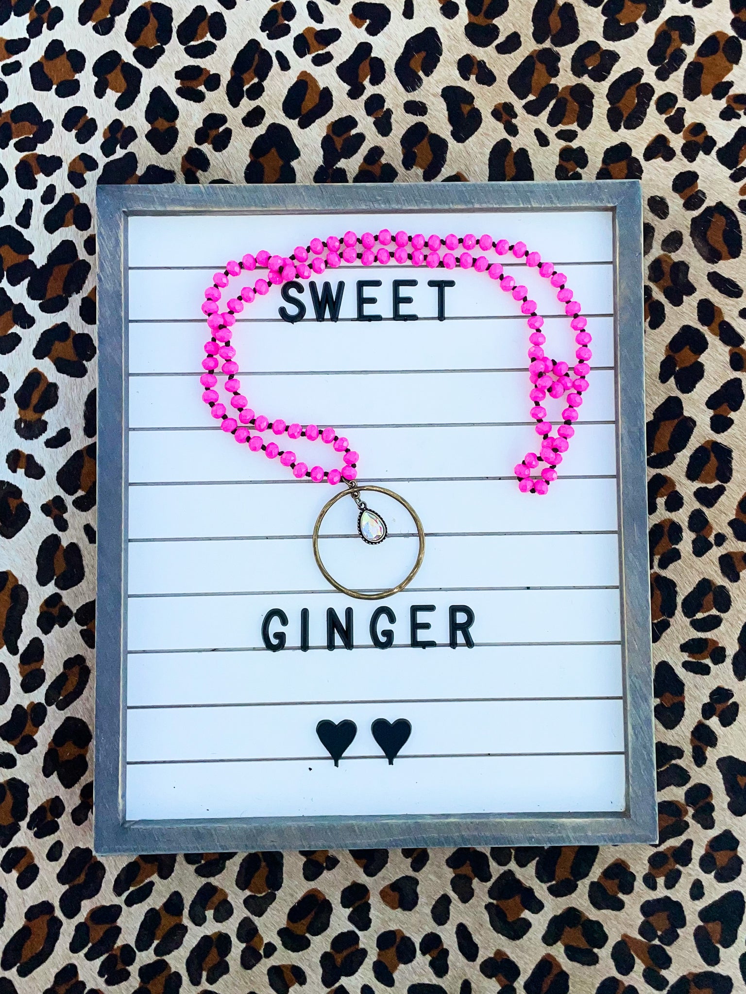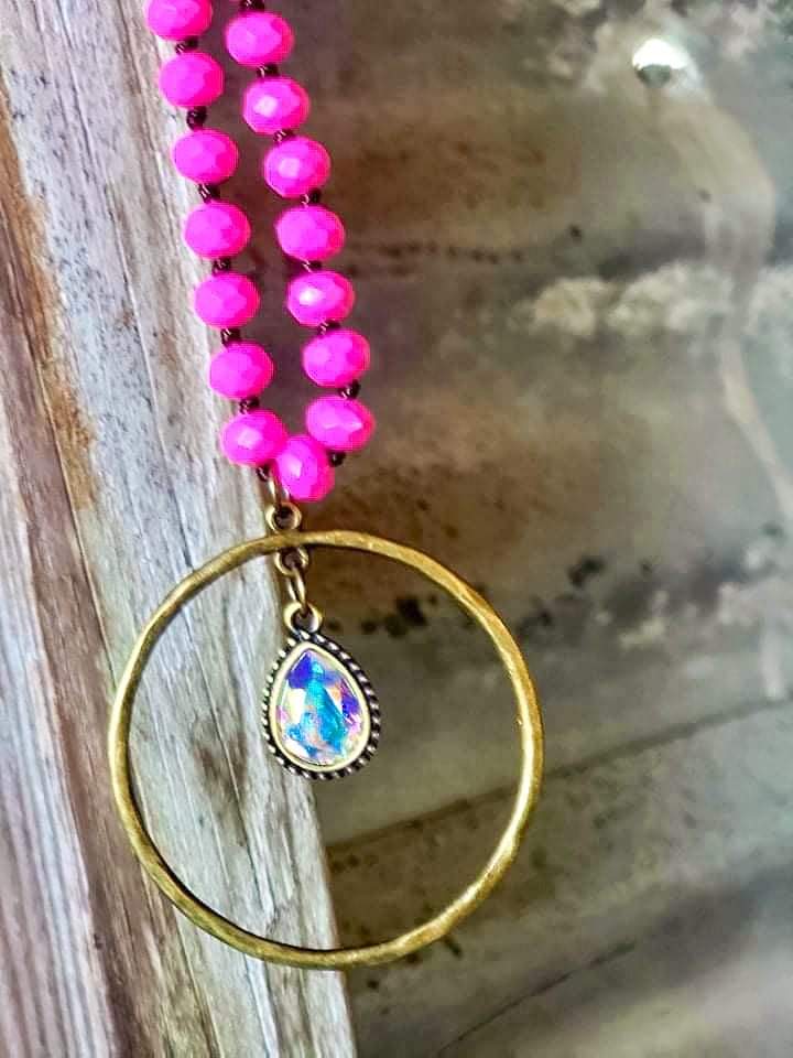53 mm, bronze, hammered circle with a beautiful cut pear shaped AB stone inside, dangling from the circle. A true statement piece.